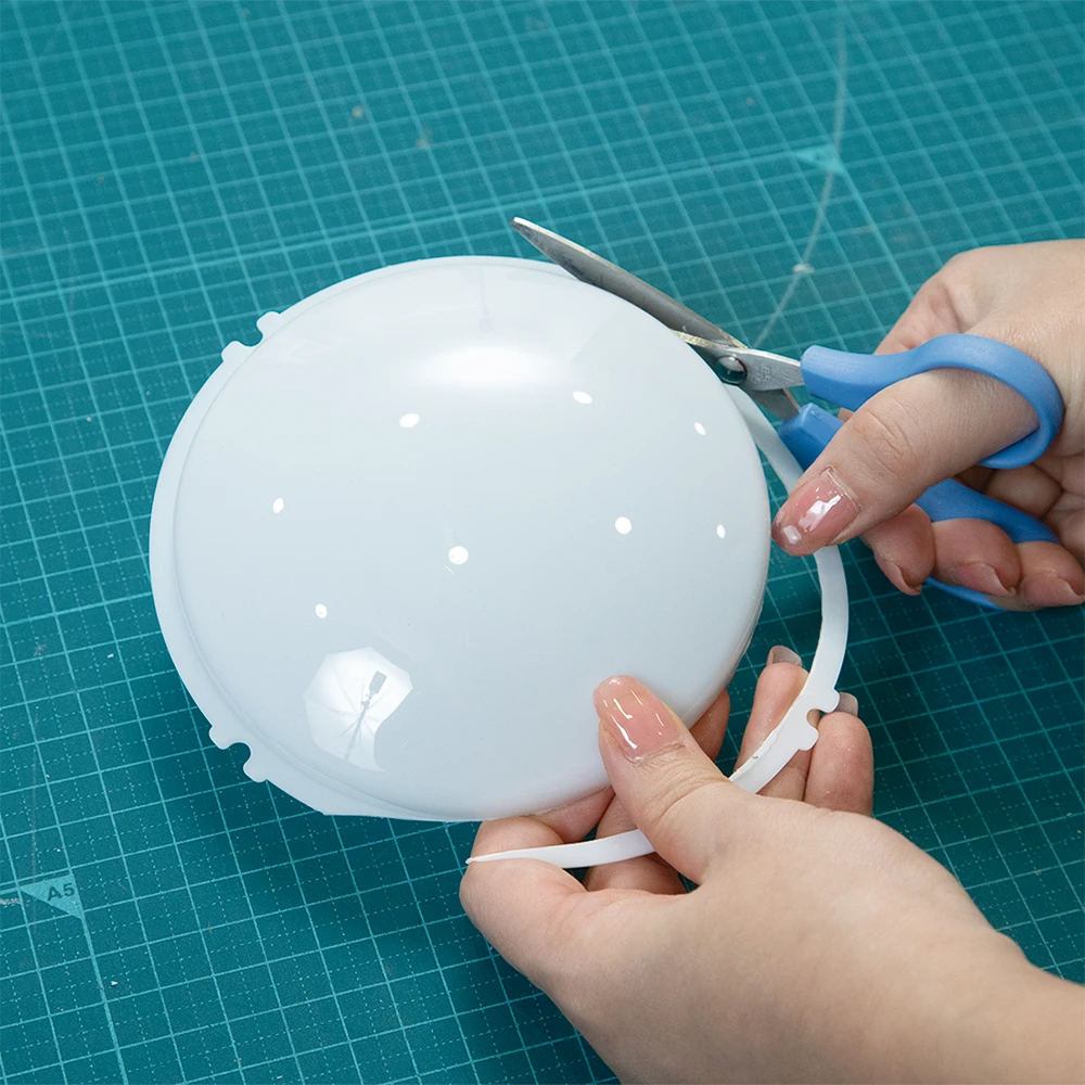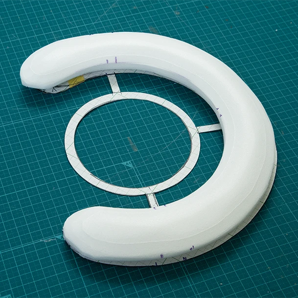 残り2枚の中心を5mmほどくぼませたら、先ほど切ったパーツを貼りつける。