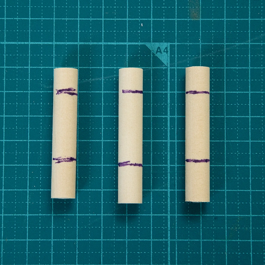 1. 細い方(8〜10φ)の木の棒を、6.5cmで3本切り出す