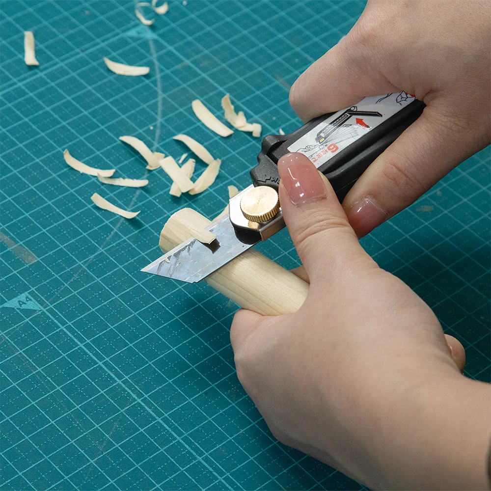 端から2〜3cmほどのところに印をつけ、えんぴつを削るような要領でカッターで削っていこう。