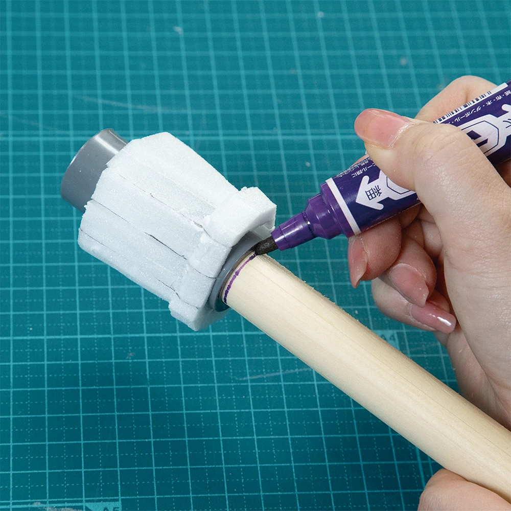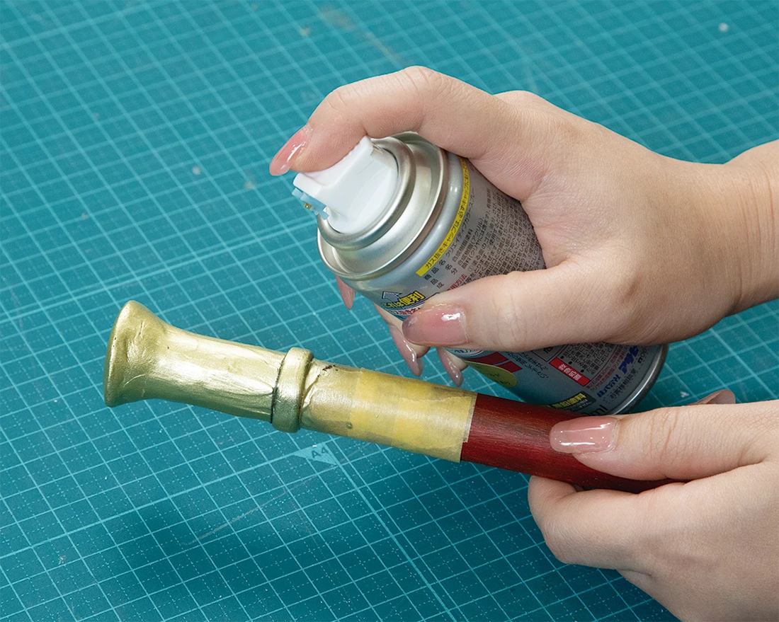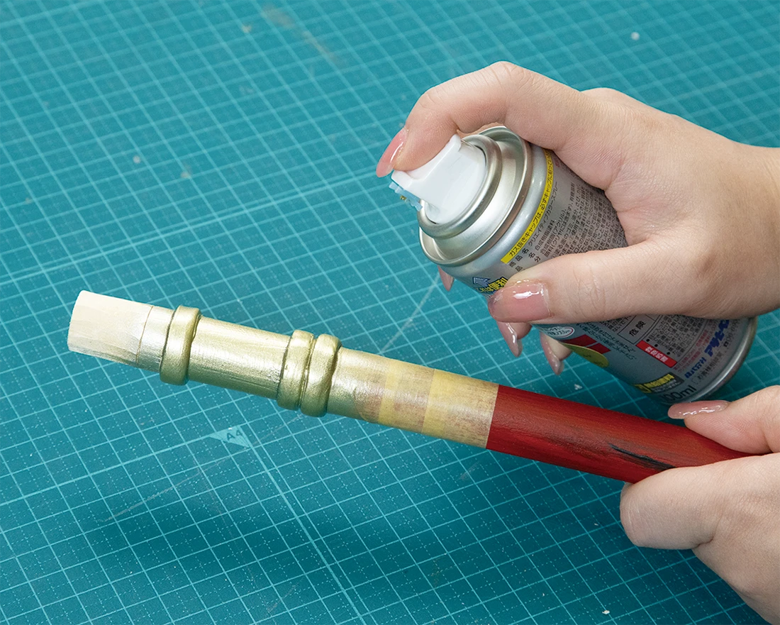 木の棒を塗装する際は、マスキングテープを貼って他のところに金色がつかないようにしよう。