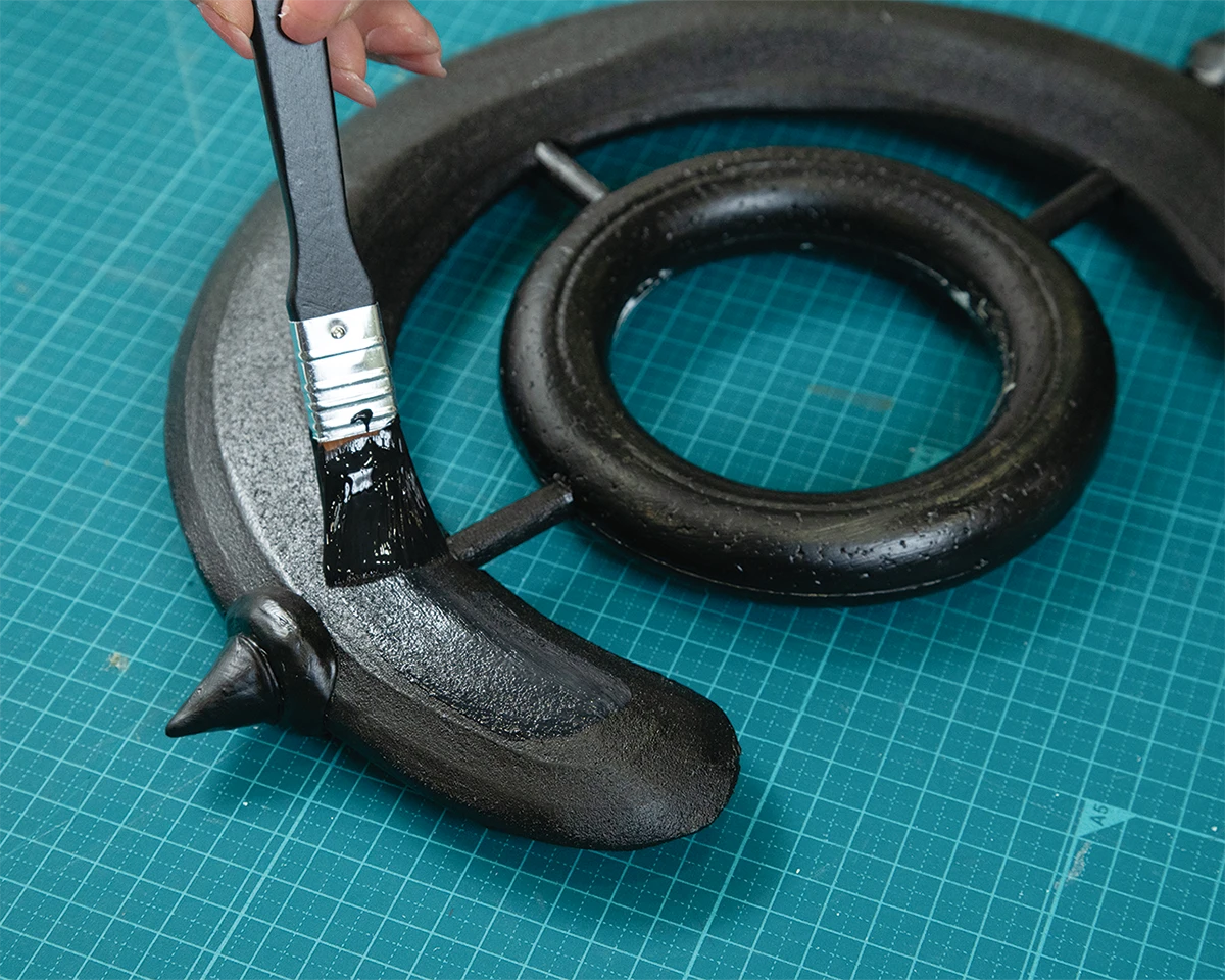 速乾木工用ボンドと黒い絵の具を5:2で混ぜて下地を作り、金色に塗装する部分に塗る。
