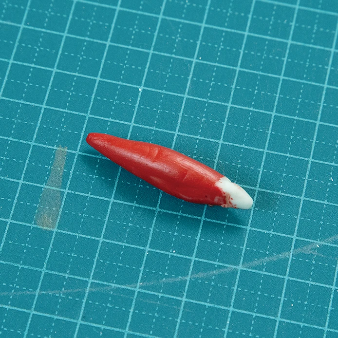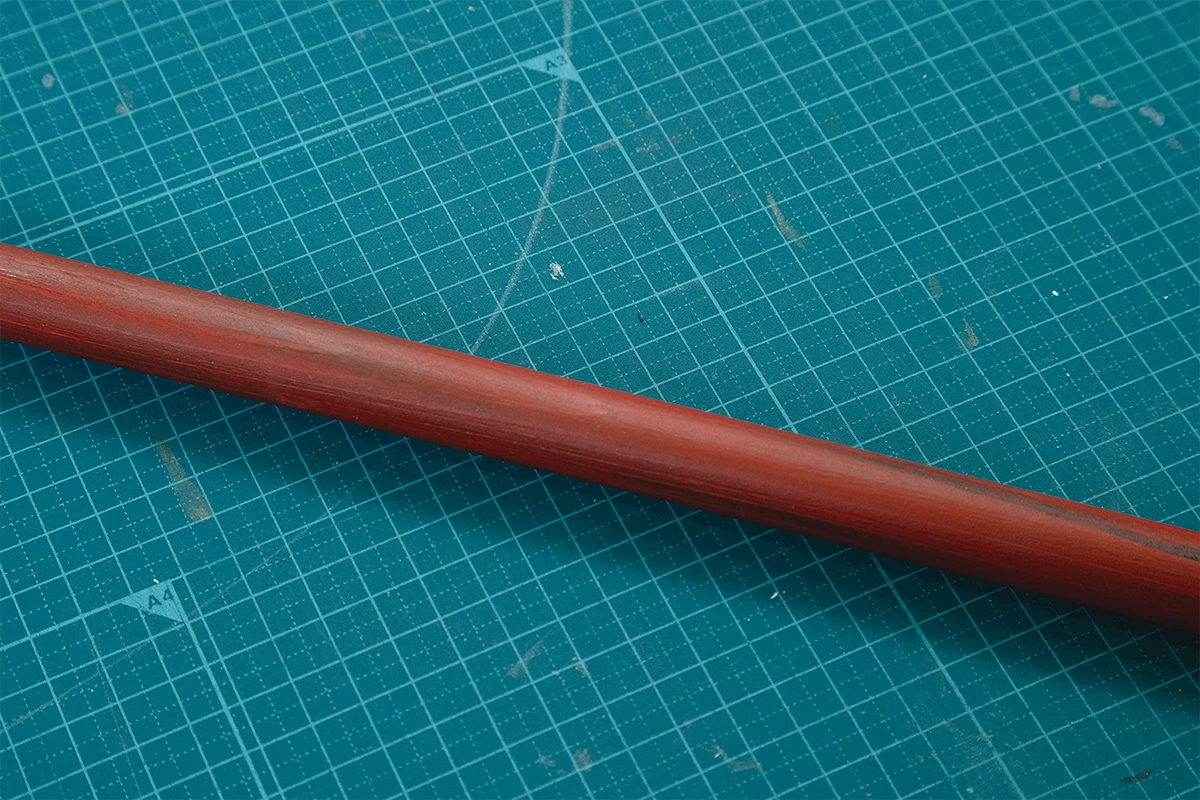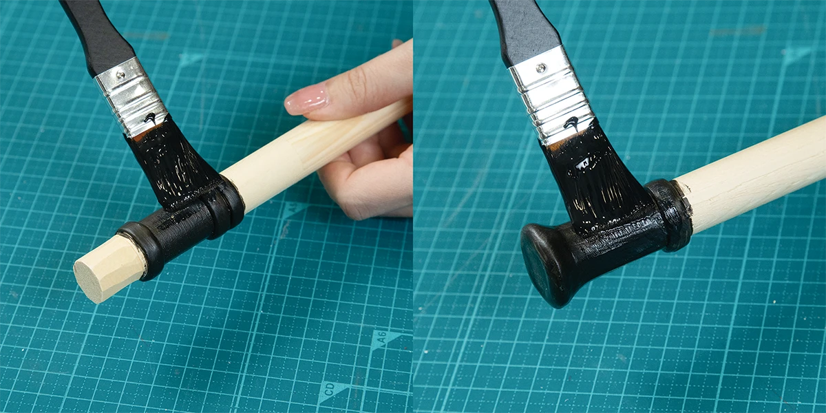 1. 木の棒の持ち手部分と粘土パーツを赤で塗る