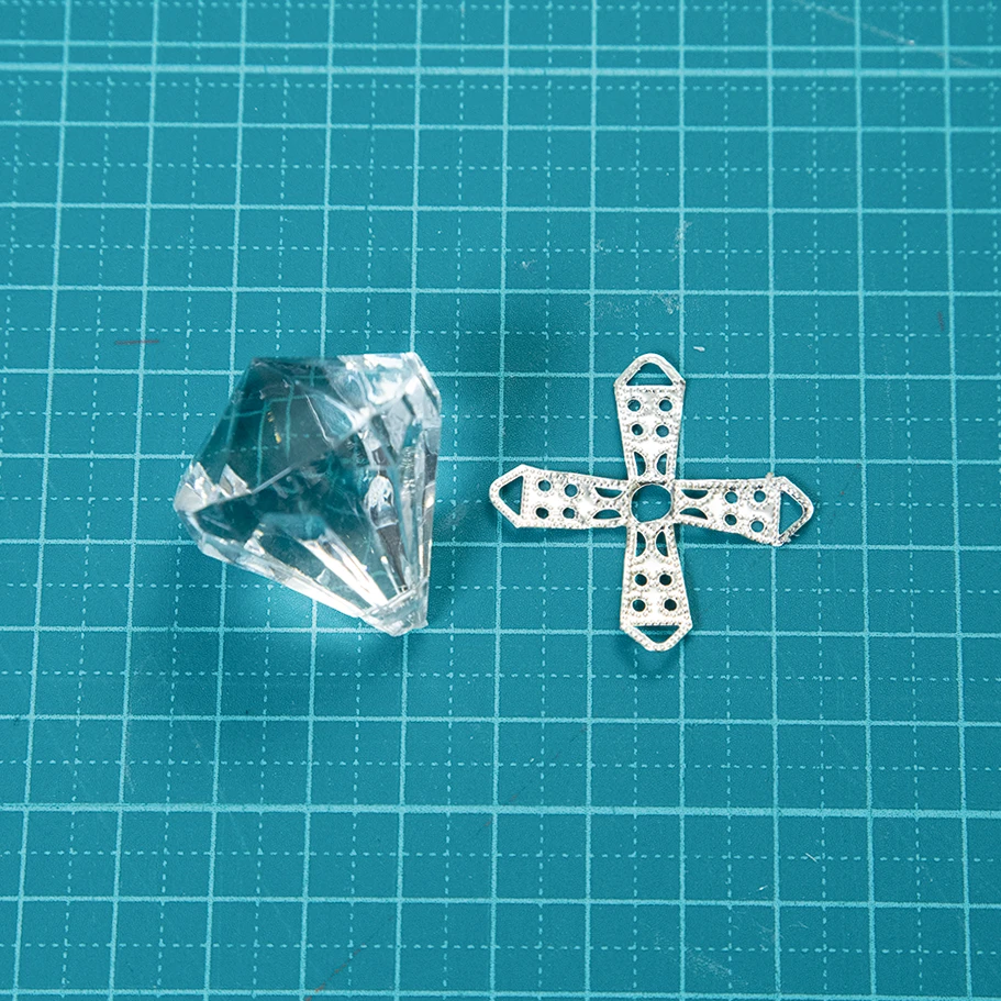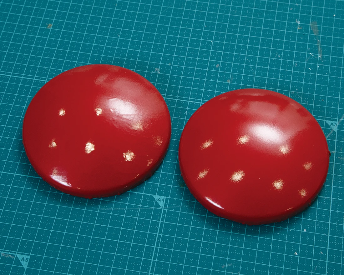 金色に塗装した本体部分の真ん中に丸パーツを貼る。
