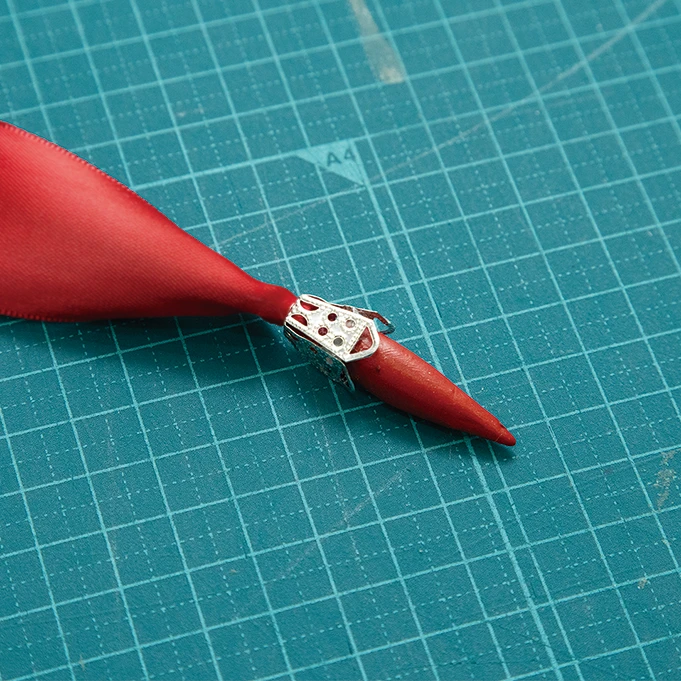 2. 丸パーツを貼り、赤のリボンを杖に巻く