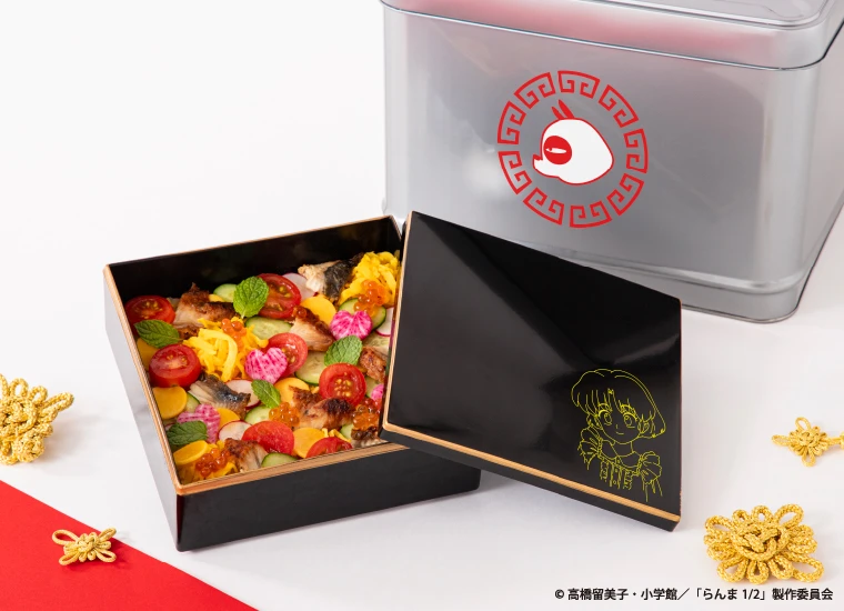 キャラクターたちをイメージしたフード、デザート、ドリンクなど、「らんま1/2」ならではのメニューをご用意、おかもち風のケースに入れて提供。