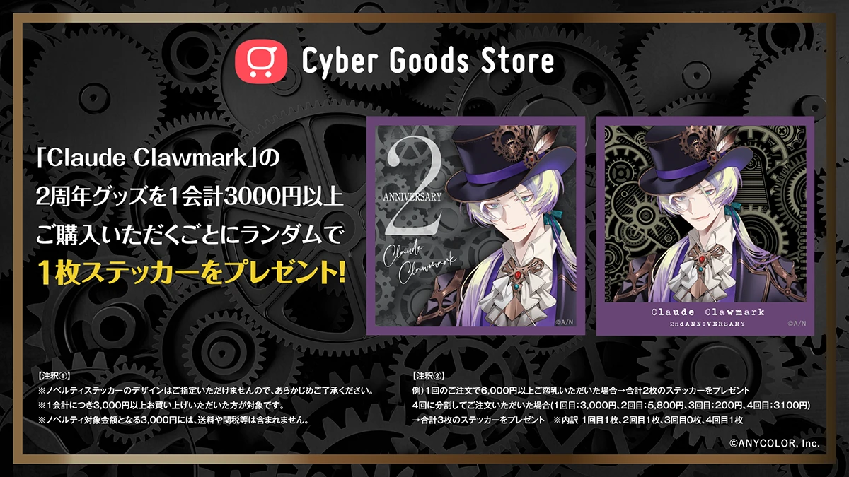 Cyber Goods Storeにて「Claude Clawmark(クロード クローマーク)」の2周年記念グッズを1会計3,000円以上ご購入いただくごとに、ランダムで1枚ステッカー(全2種)をプレゼント。