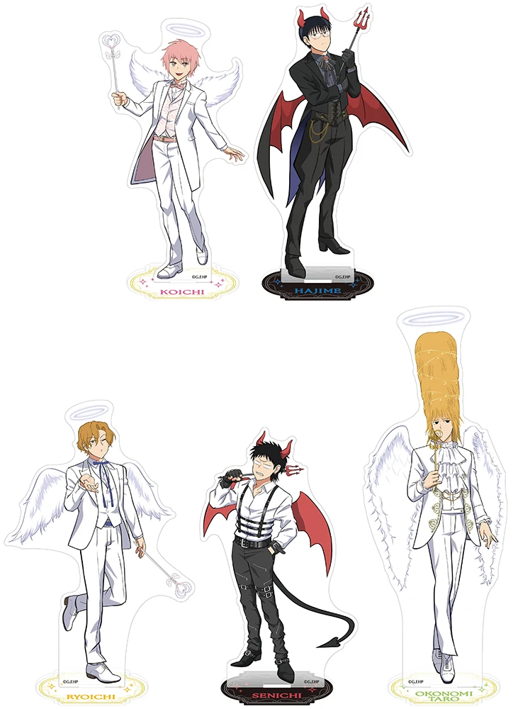 本オンリーショップでは、天使や悪魔風の衣装を身につけたコーイチ、ハジメ、リョーイチ、センイチ、おこのみ太郎のイラストを使用したアクリルスタンドやアクリルステッキなどの新商品を販売。