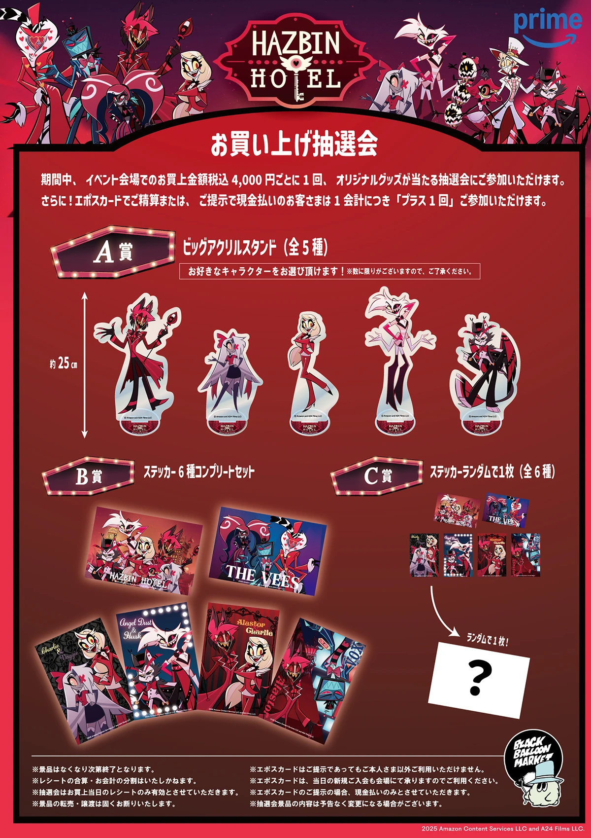 期間中、イベント会場でのお買い上げ金額税込4,000円ごとに1回、『Hazbin Hotel』グッズが当たる抽選会にご参加いただけます。