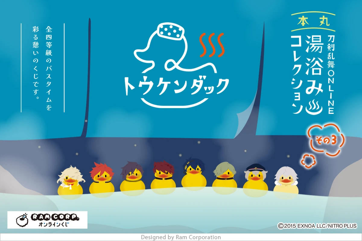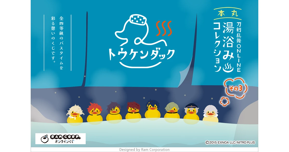 湯浴みコレクション第3弾となる今回のくじは、第2弾に引き続き、刀剣男士たちが”お風呂のアヒル”になった「トウケンダック」シリーズを全等級にラインナップ。