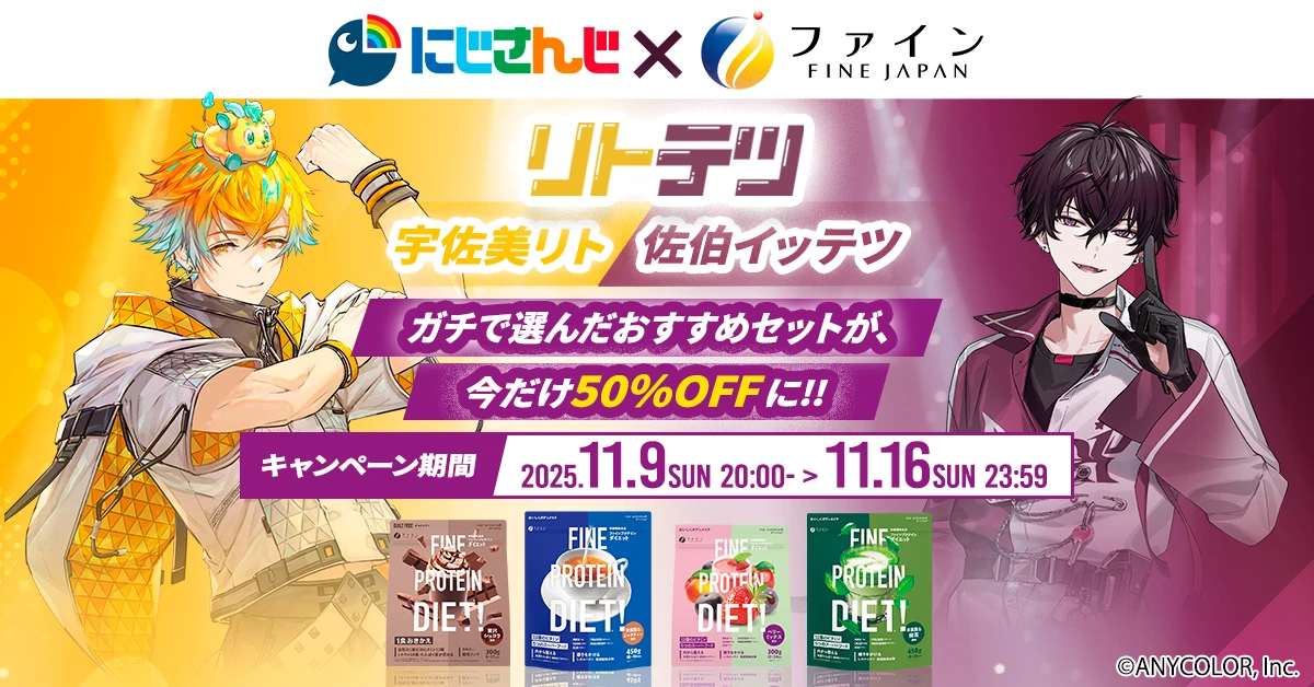 VTuberグループ「にじさんじ」所属の宇佐美リト、佐伯イッテツとプロテインシリーズ「ファインプロテインダイエット」のコラボ企画「#にじファイン」が、2025年11月9日(日)より実施される。