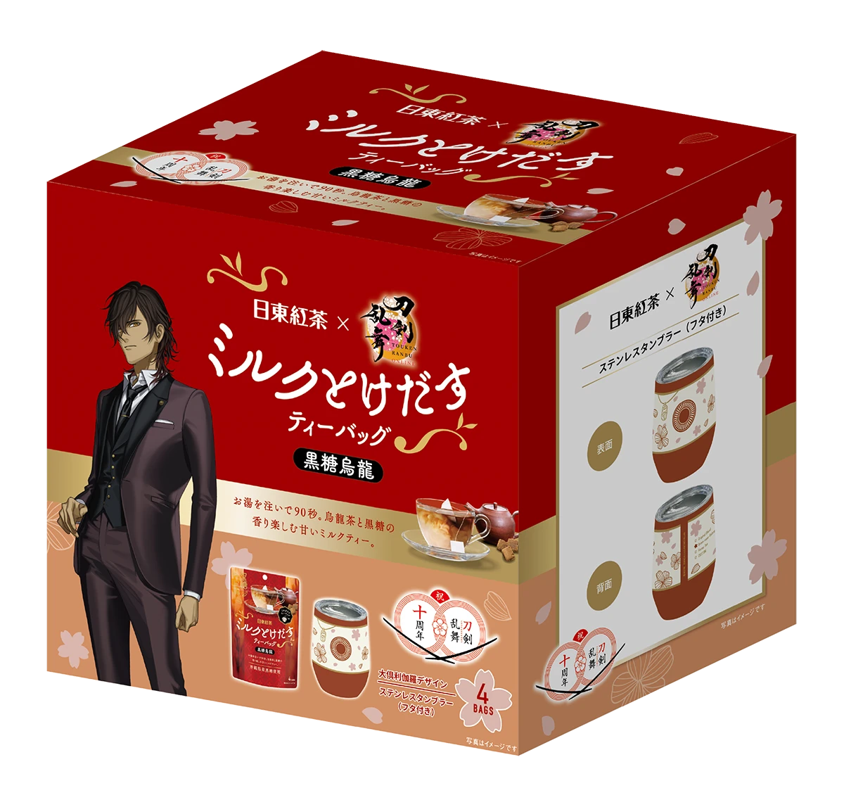 パッケージには刀剣乱舞十周年を記念して描き下ろされた新たな装い「祝装」をまとった3振りがデザインされており、その中にコラボデザインのステンレスタンブラーと日東紅茶商品が入った詰め合わせ商品となっている。
