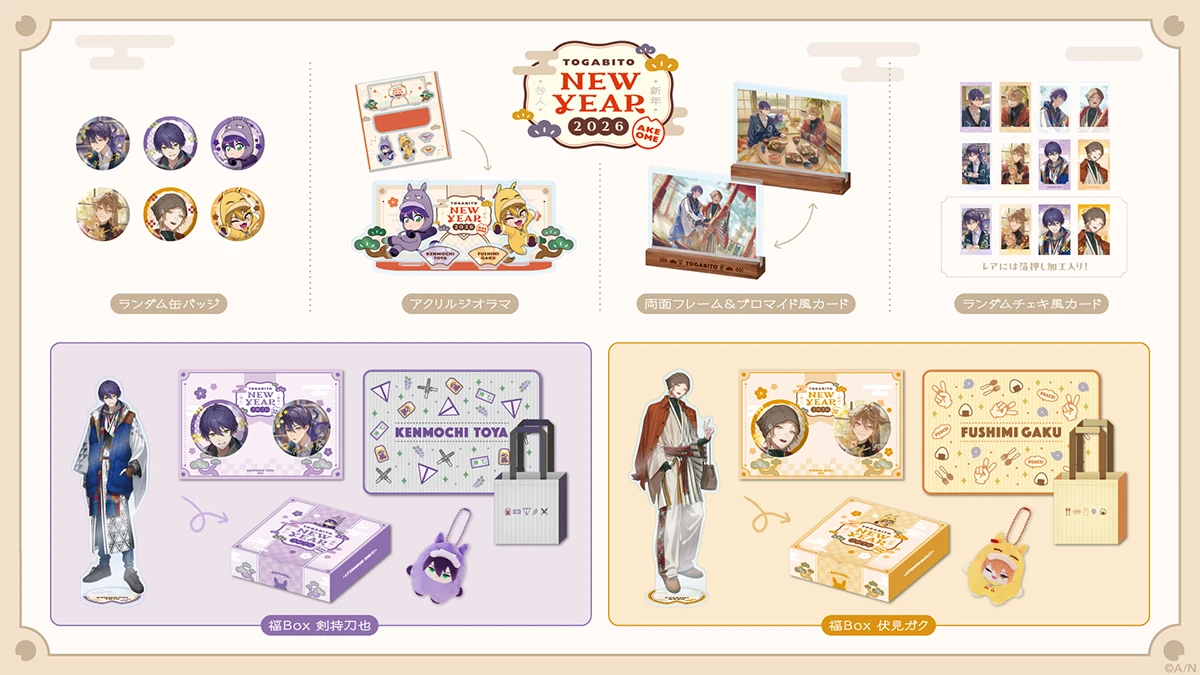 「にじさんじ」所属の剣持刀也、伏見ガクの「TOGABITO New Year 2026 -AKEOME-」グッズが登場!