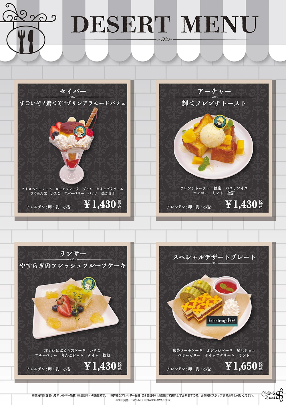 本カフェでは、TVアニメ『Fate/strange Fake』に登場するセイバー、アーチャー、ランサーをイメージしたコラボメニューが登場。