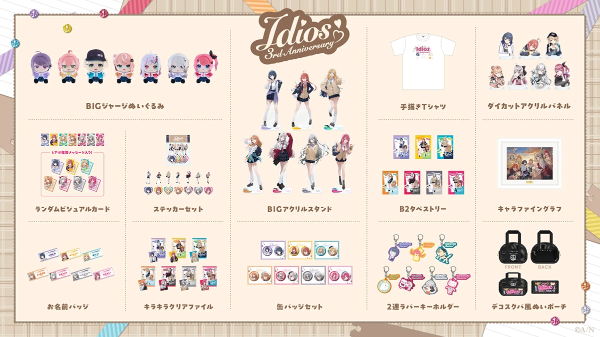 VTuberグループ「にじさんじ」所属の小清水透、獅子堂あかり、鏑木ろこ、五十嵐梨花、石神のぞみ、ソフィア・ヴァレンタイン、倉持めるとによるユニット「Idios」3周年を記念したグッズが登場!