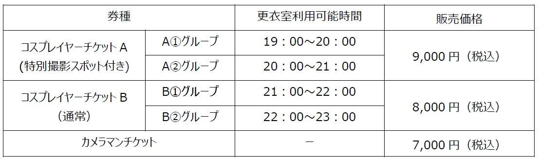 ※コスプレイヤーチケットには更衣場所とクロークサービスが含まれます。