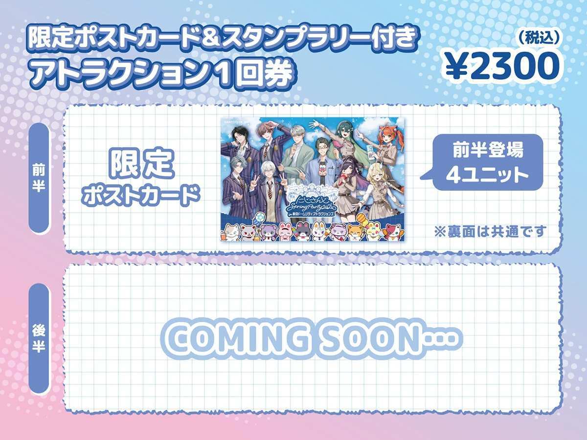 ※アトラクション1回券の限定ポストカードは前後半の各期間に登場するユニットの全員集合デザイン(1枚)です。複製手書きメッセージは付きません。