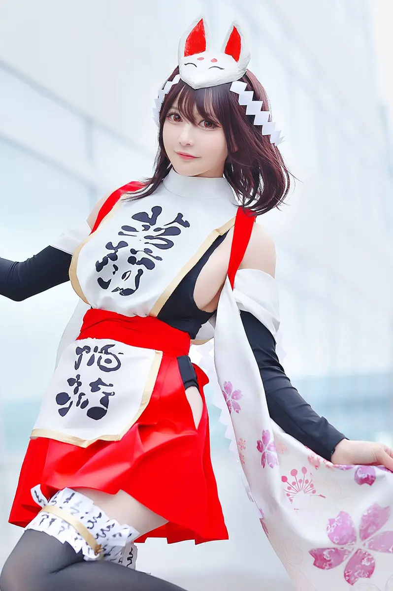 張り子で作ったお面の塗装に、見頃&袖に使用した染め粉をつかいました。色味がバッチリ合ったと思います(*ˊ˘ˋ*)。ニーソックス、背中、お面の飾りに和紙を使うことで、衣装にメリハリがでたと思います!