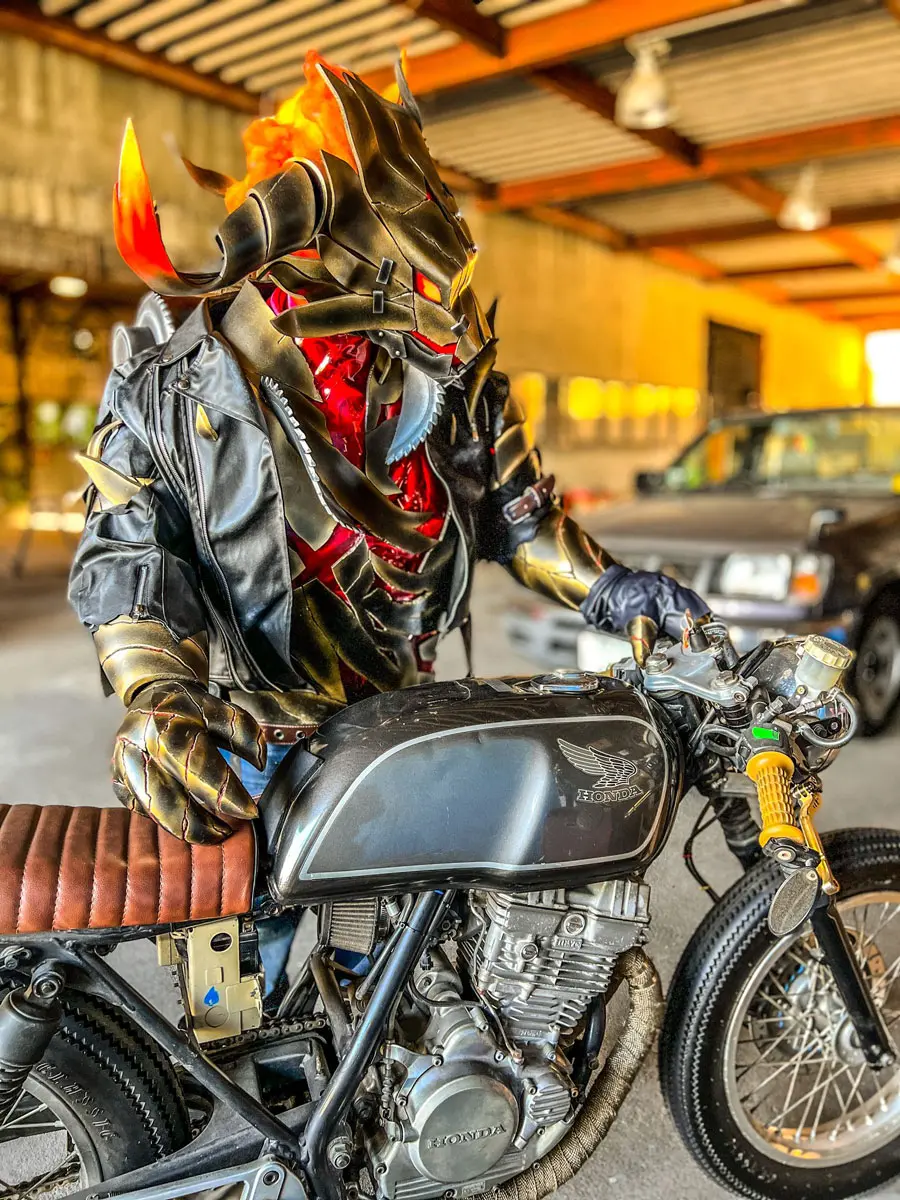 胸や脚の隙間から見える、赤い部分は暗記用下敷きを使いヒートガンで形を調整して裏張りしてます。中に赤い布をしわくちゃに入れて炎表現をしてます