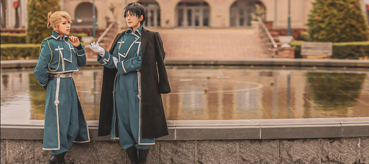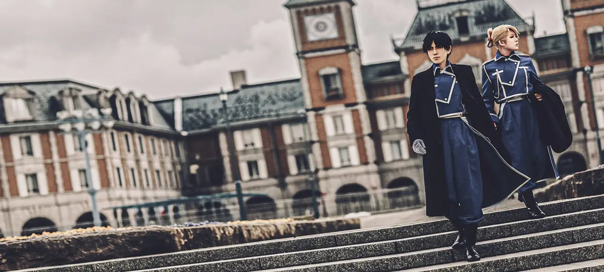 宮内さんがリザ・ホークアイに、かいりさん(@_Ukkairi3)がロイ・マスタングのコスプレで屋外でのロケ撮影。写真はたけるさん(@take393902)。