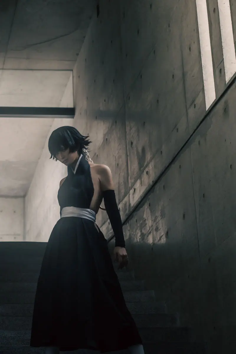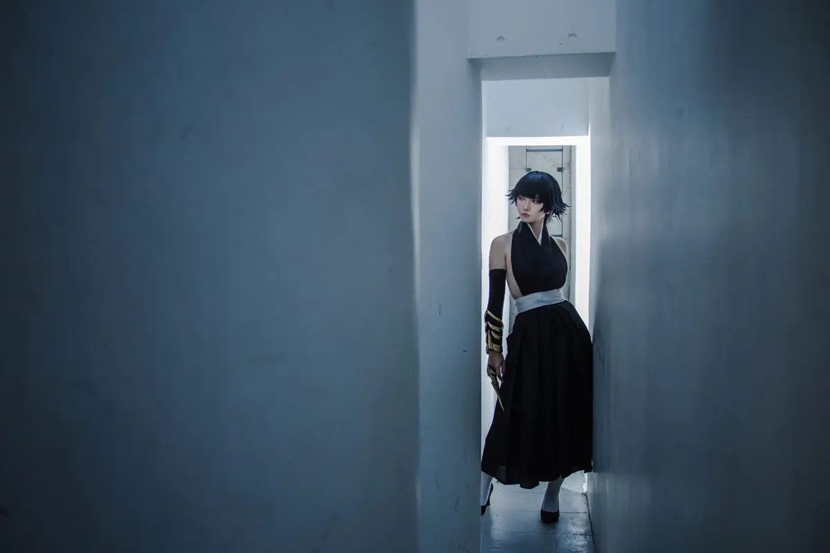 スタジオの打ちっぱなしコンクリートの寒色の雰囲気がクールな砕蜂によく似合う。撮影はくちなしさん(@h_k___)。