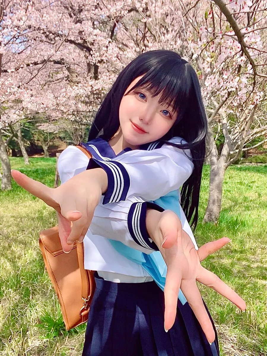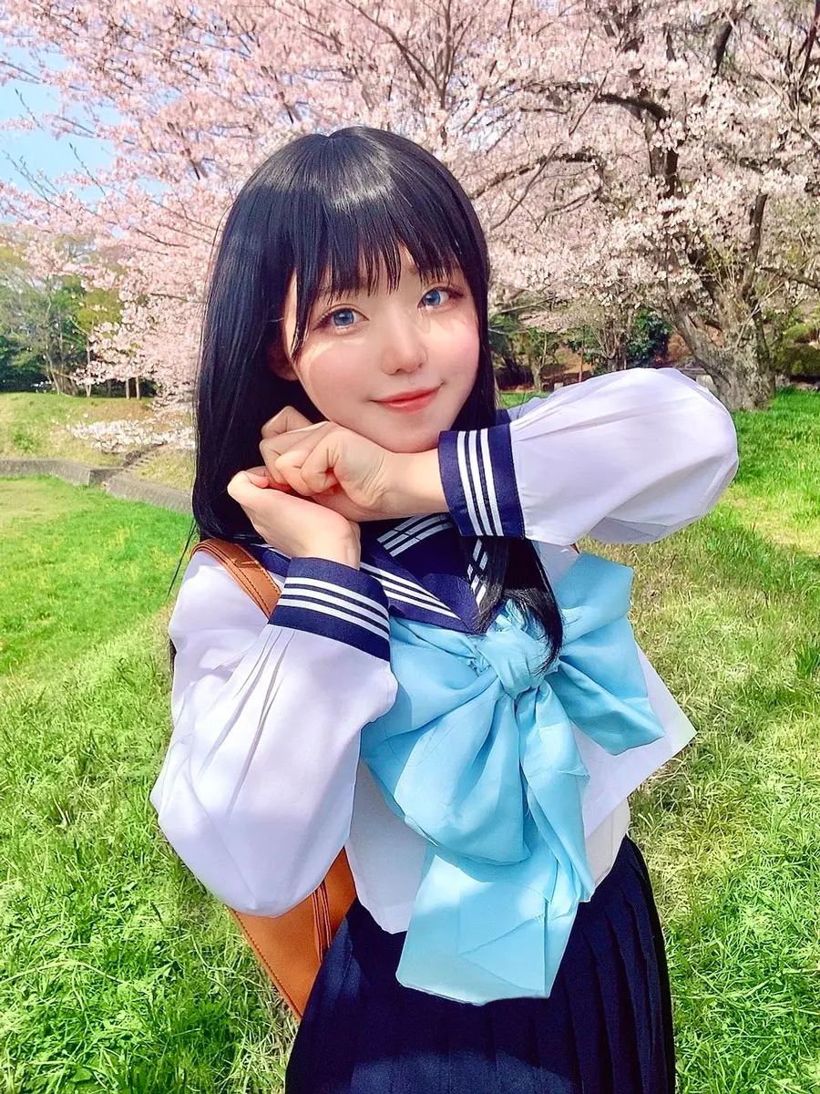 衣装はコスプレ感のない本物のような制服にしたかったため、専用のコスプレ衣装ではなく、同じ形の本物に近いセーラー服を選びました。スカート丈も短すぎず極端に長くない微妙な長さのものを使用しました。