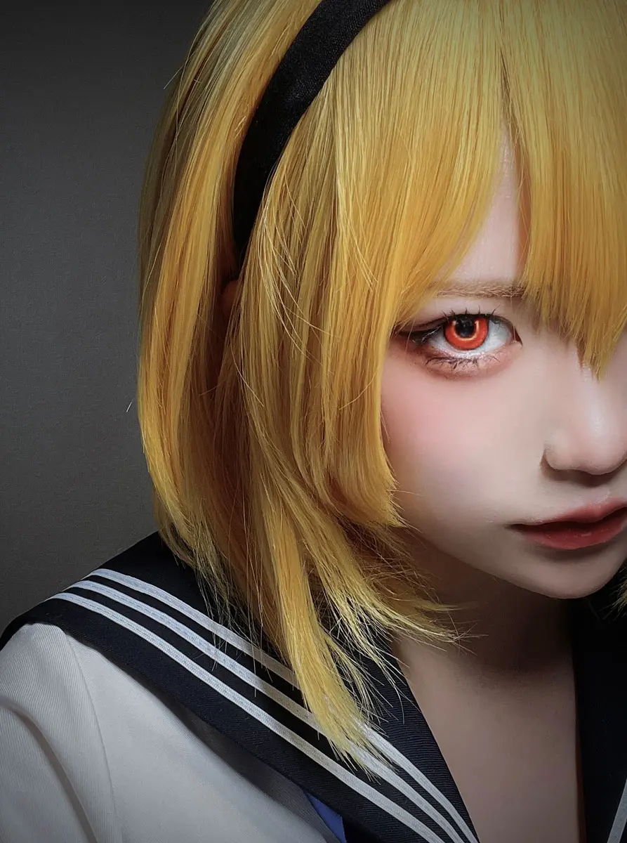 今回の北条沙都子ちゃんのコスプレでは“赤く光る目”が特徴的なので、普段よりも透明度を少なくして、鮮明な赤になるように、それでいて自然になるように調節しました。