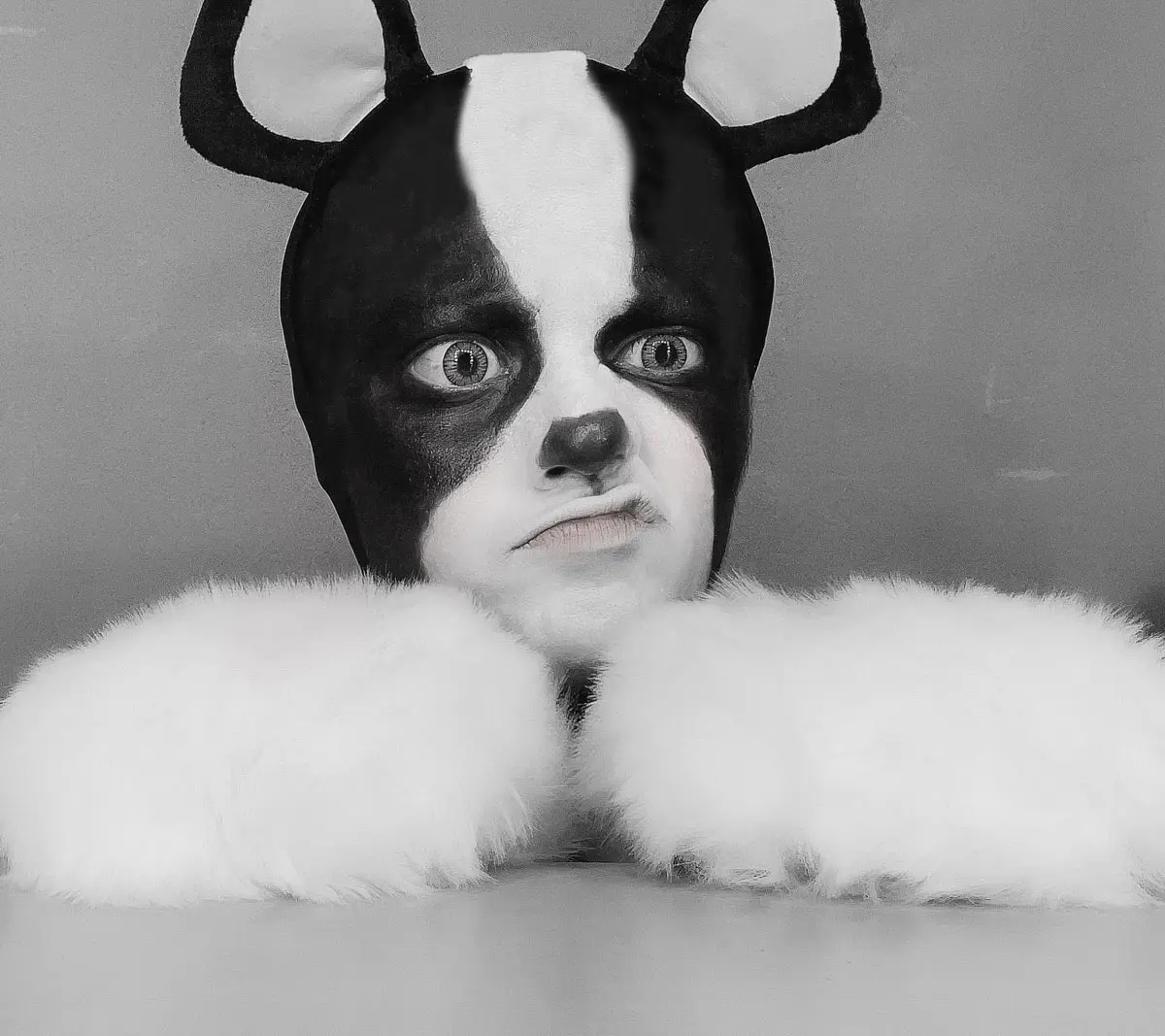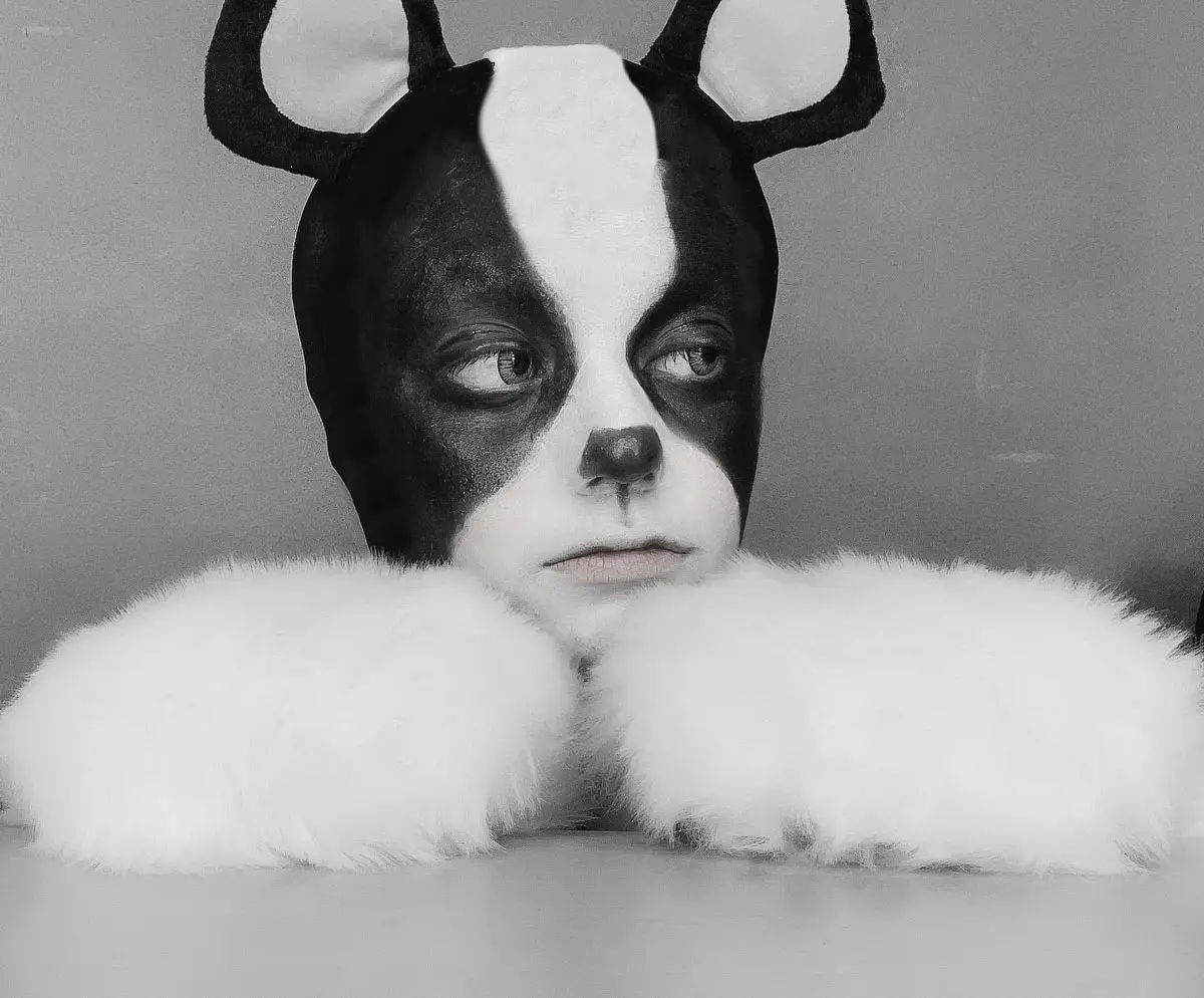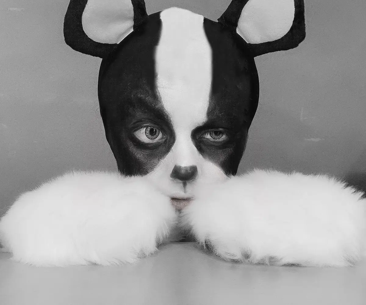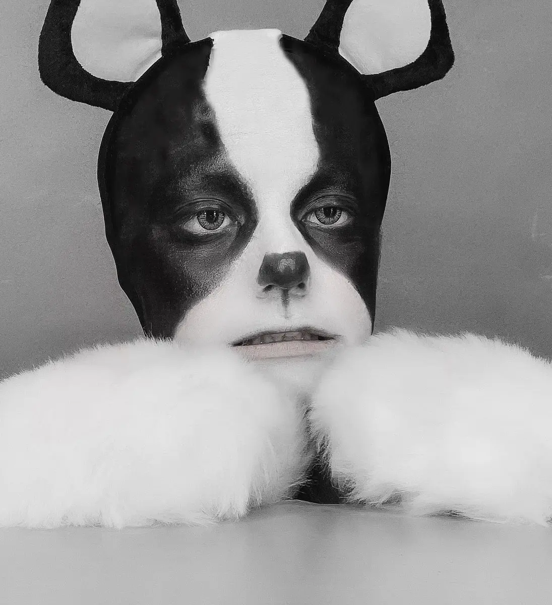 顔だけなのに無駄に全身タイツです。全身タイツの頭部分に犬耳をつけて、自撮りしました。
