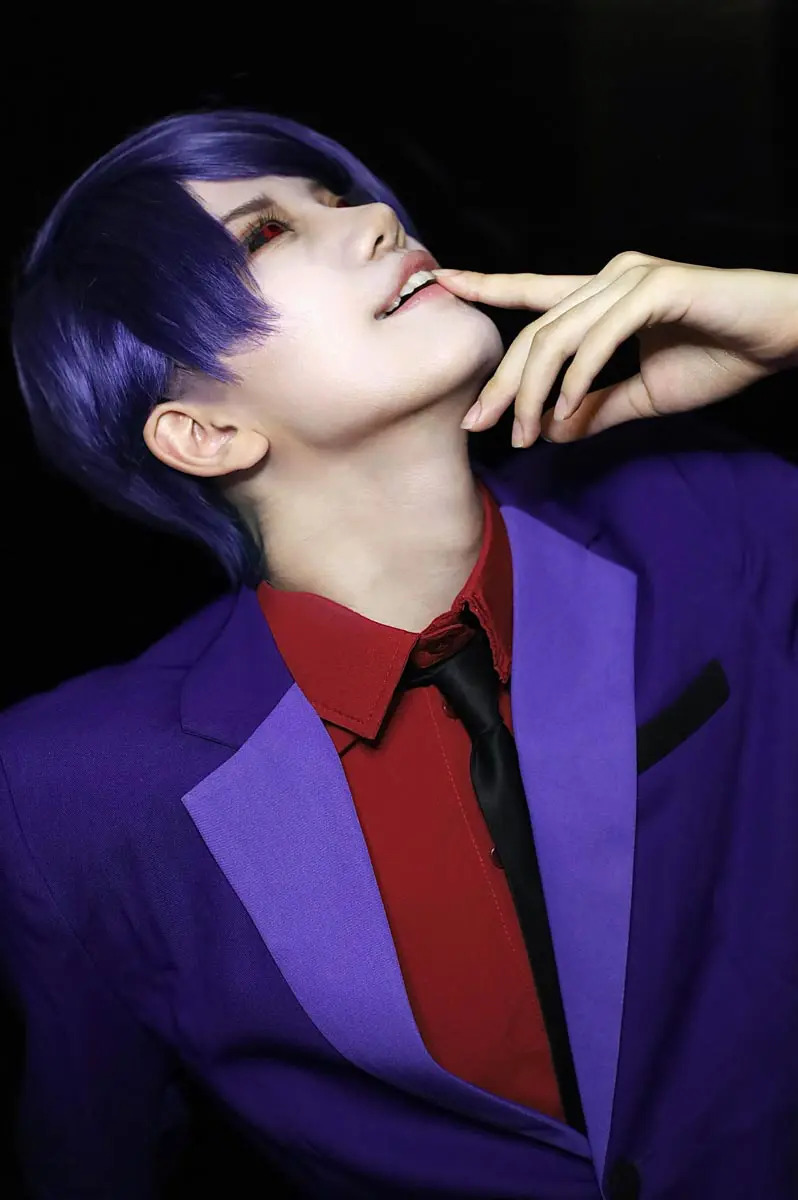 ウィッグはとにかくタイトに、スマートになるように意識しました!月山習の大人の男性という感じを出すために、目頭に「つ」を書くようにシャドウを入れました!また肩幅をとにかく広くして、目をとにかく細長くするメイクをしています。男らしさと喰種の狂気さが出ていたら嬉しいです!!