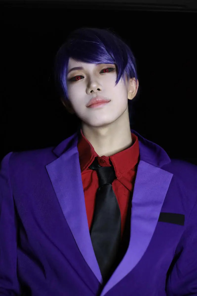 通常の月山習の目の色である紫のカラコンをつけて、赤に加工。白目部分は加工で黒く塗りつぶし、なおかつ喉仏の陰影も描く。いっそう“本物”感が倍増する喉仏の陰影は目からウロコ。是非男装の際には喉仏の陰影にもこだわってみると、また新しいコスプレの楽しみ方が増えるかもしれない。