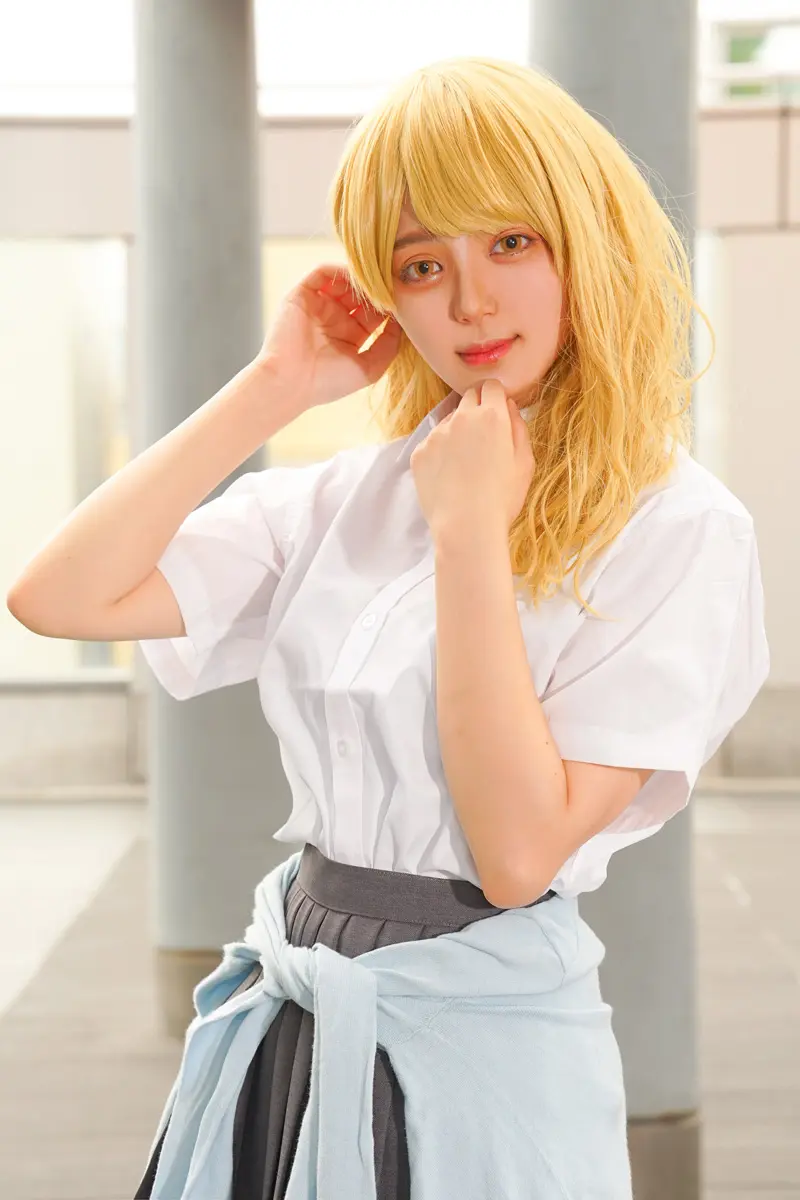 ▲高校生キャラなので、あまりメイクが濃くならないようにナチュラルにしました。単発なのでウィッグも透けないように意識したのと、シルエットが丸くなるように意識しました
