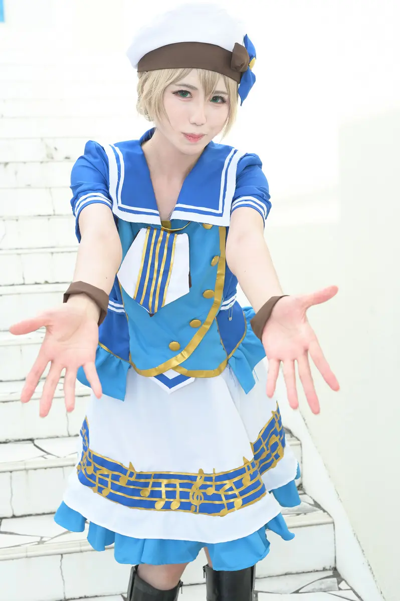衣装はお譲り頂いたものです。白ズボンをより身体に合うようにしました。メイクは小学生の設定なので、濃くなりすぎないようにしました。