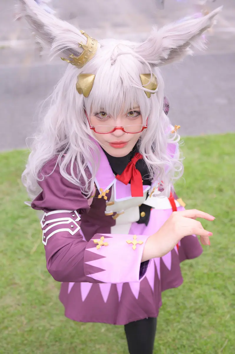 ウマ耳をウィッグと同じ毛束で作り、針金でタレ耳にもできるようにしました。メイクは特徴的な赤いシャドウを入れ、使用カラコンはエティアプリズムワンデーのプリズムグレーです。