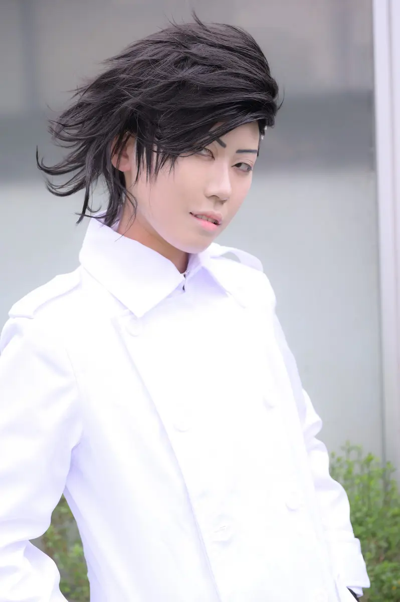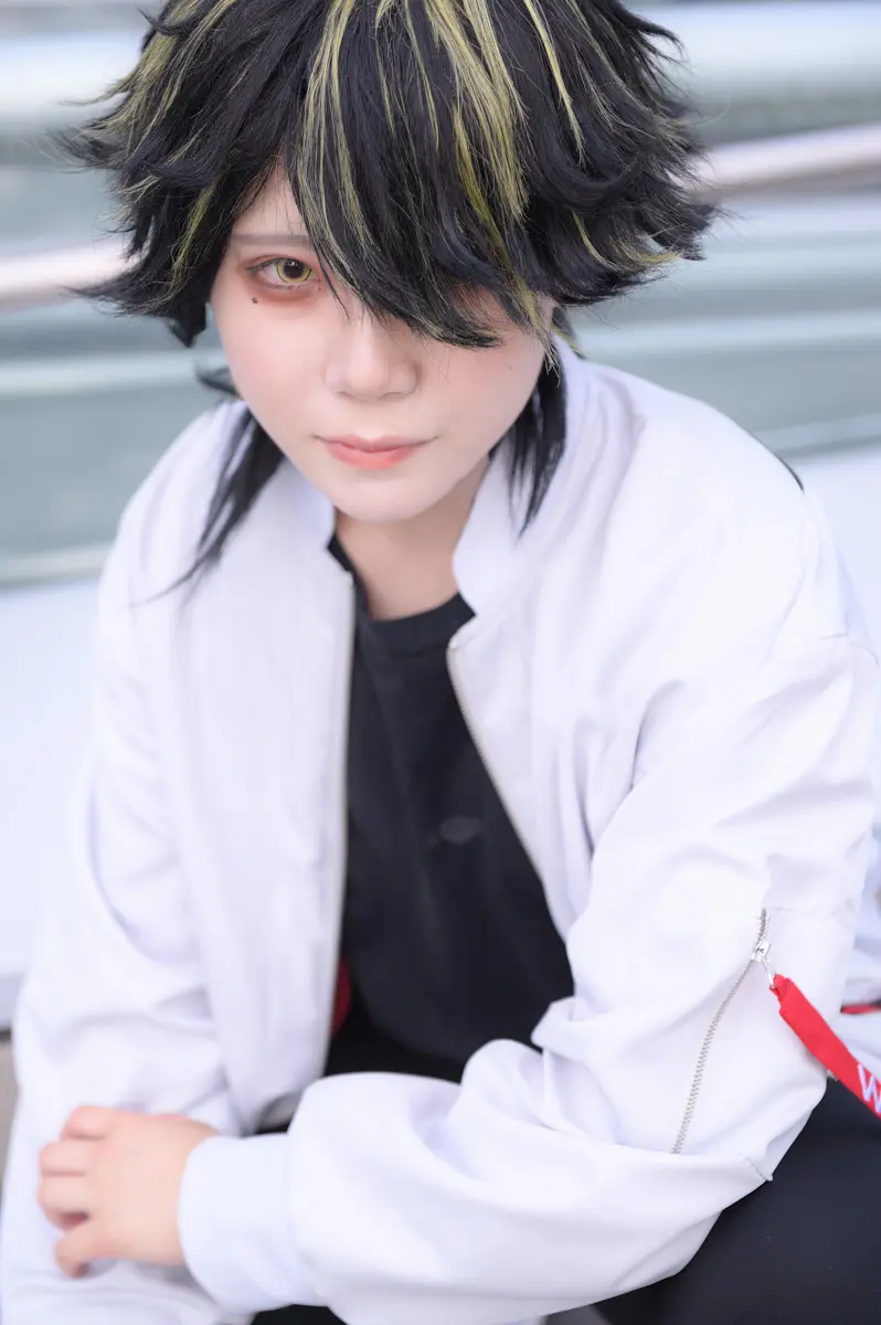 アイメイクを濃くして男らしさを表現しました。ウィッグはキャラウィッグ。衣装はコストモで購入しました。