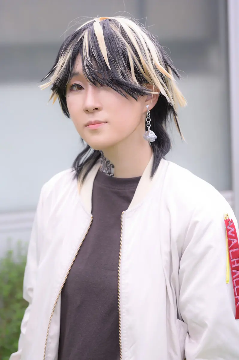 骨をイメージしたデザインの防具を製作しました。メイクやウィッグはまちなかにいそうな普通の青年感を出しました。使用カラコンはアシストシュシュツインループのジャズパープル。