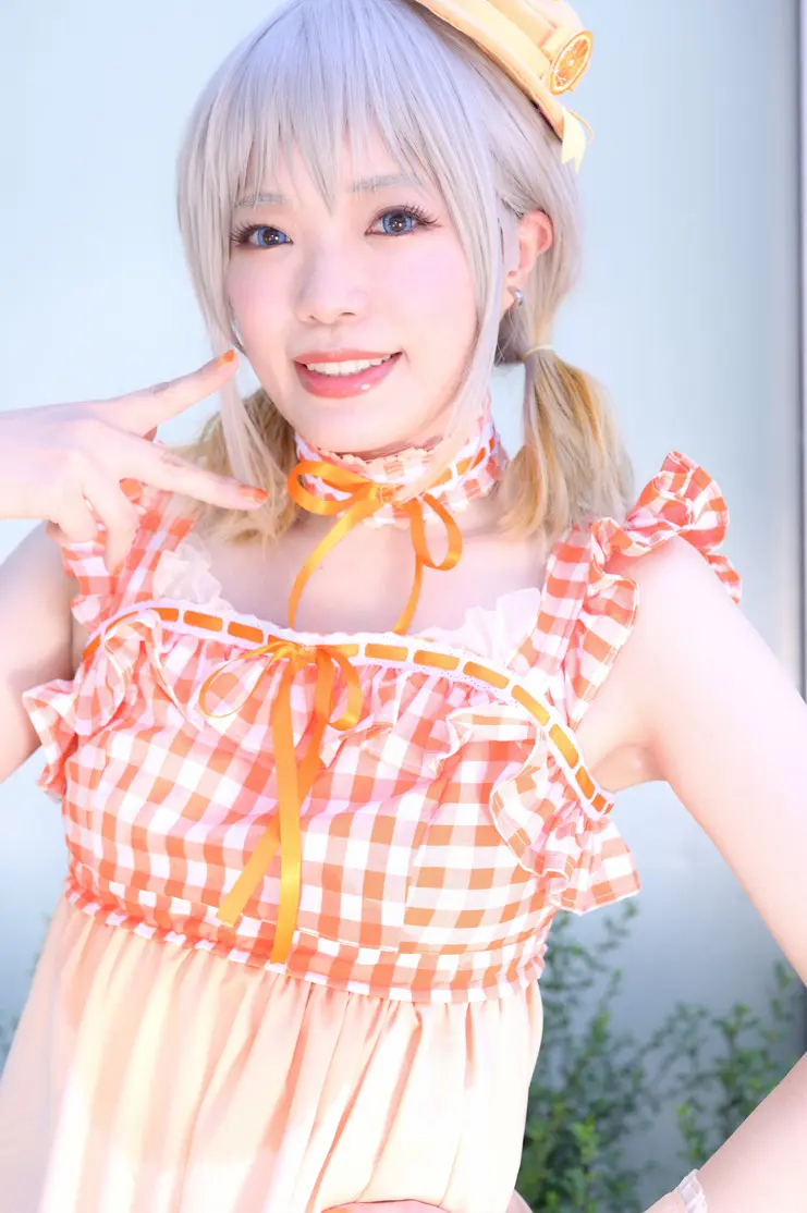 キャラは外国人設定ではないのですが、ホリが深いメイクを目指しました。ウィッグはアシスト。ツインテールのふわふわ感にこだわりました。着用カラコンはエティアクールワンデーのマスカットです。