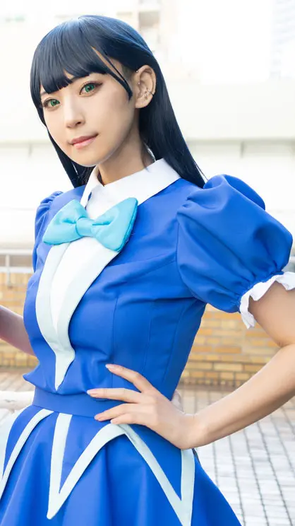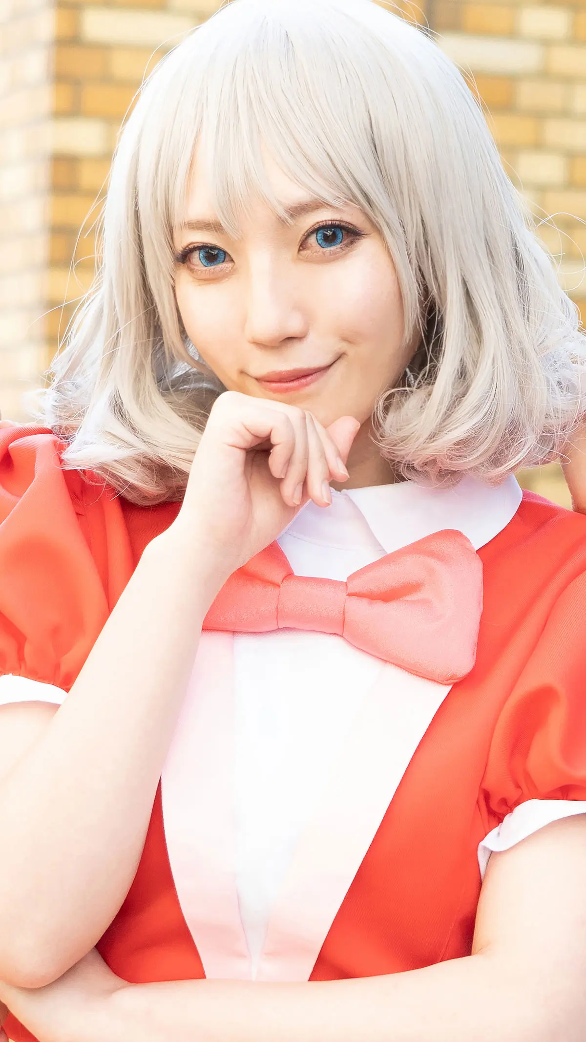 キャラの大きなタレ目を意識して、テープで引き上げています。カラコンはフランミーのショコラブラウン。ロングウィッグをボブにカットして、ふわっと内巻きになるようにコテで固めました。