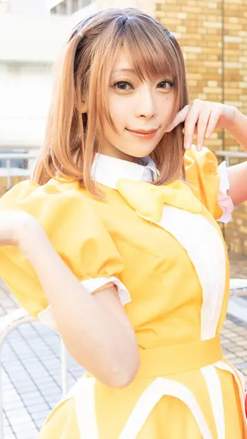 衣装の黄色にあわせて、暖色系の色を使ってメイクしました。ウィッグはブライトララのコーラルブラウン。使用カラコンはルナナチュラルのアーモンドです。